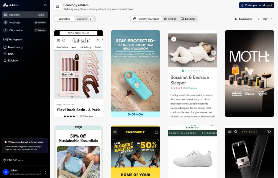 Przy obsłudze ponad 20 klientów nasz grafik nie wyrabiał. AdDrip pomaga nam szybciej testować nowe reklamy pod eCommerce. 49zł to śmieszna cena w porównaniu do podobnych serwisów.